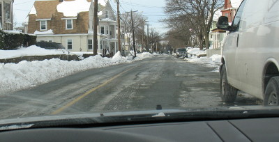Here's the classic shot of a Salem street that is too narrow to start and is narrower in the snow. Is that car ahead parked? On the street? On the sidewalk?