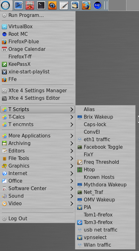 Things that I want quickly available, but, not on one of the hidden panels, can be added by manually editing xfce-applications.menu. From VirtualBox to xine-start-playlist are in this category. I also add my own sections with additional items, like T-Scripts to launch some scripts. I move the menu default to /home/me/.config/menus/ and do the mods there. The basic menu is PCLinuxOS style.